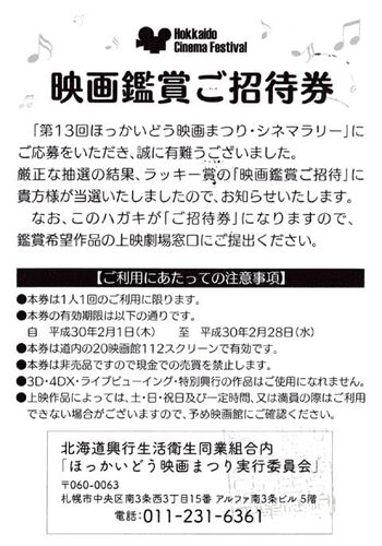 映画鑑賞ご招待券 が当たりました~ 昨年の第12回ほっかいどう映画まつり★シネマラリーでは 3ヶ月フリーパスが当たり、週に5本のペースで映画を観て、もんのすんごく 疲れたので、今年は1本映画を観られる招待券で充分でございます。 11月1日から12…